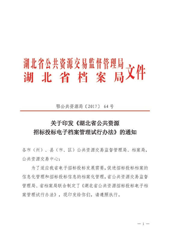 湖北省公共资源招标投标电子档案管理试行办法(鄂公共资源局〔2017〕64号)